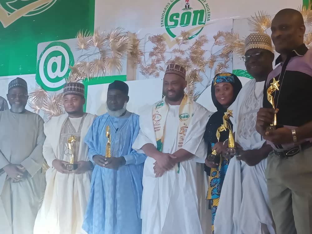Safiyanu Hassan (MD Gerawa Oil Mill, Ibrahim Mohammed Mustapha (MD Ammasco In’tl), Imran Amin (Chairman Al-wabel Rice Mill), DG SON, Hafsat Bankole (QUALITY ASSURANCE MANAGER, ILERA AGRO), Mohammed Isyaku (MD Gerawa Rice Mill), Mr Ayo (Head of Marketing, Royal Foam and Chemical products) at SON 50th anniversary and exhibition of MANCAP Certified products in Kano