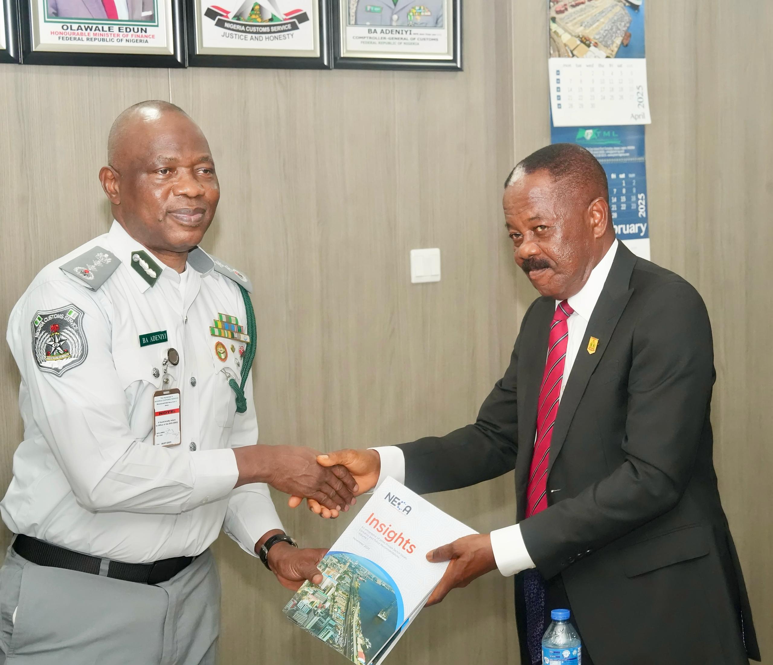 NECA President, Dr. Ifeanyi Okoye, led a delegation on a courtesy visit to Comptroller-General of Customs, Bashir Adewale Adeniyi, on April 7, 2025, to strengthen collaboration on trade facilitation and private sector development.